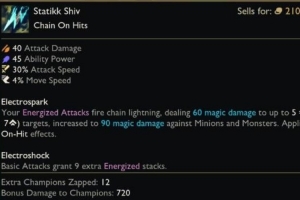 你的盈能攻击会触发一道闪电。对4-7(基于等级)个敌人造成60点魔法伤害,对小兵和野怪提升至90,这个伤害会触发攻击特效